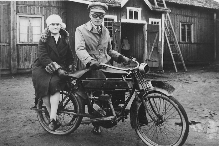 Kotiseutukokoelma0108B 22.11.2015Täysi resoluutio (700 × 467) ← Edellinen Seuraava → Valokuvaaja Koskisen v. 1923 Katteluksen Ylitalon pihalla ottama kuva Arvo Katteluksesta moottoripyörineen. Takaistuimella Arvon sisar, myöh. sosiaalineuvos Hilda Kattelus.