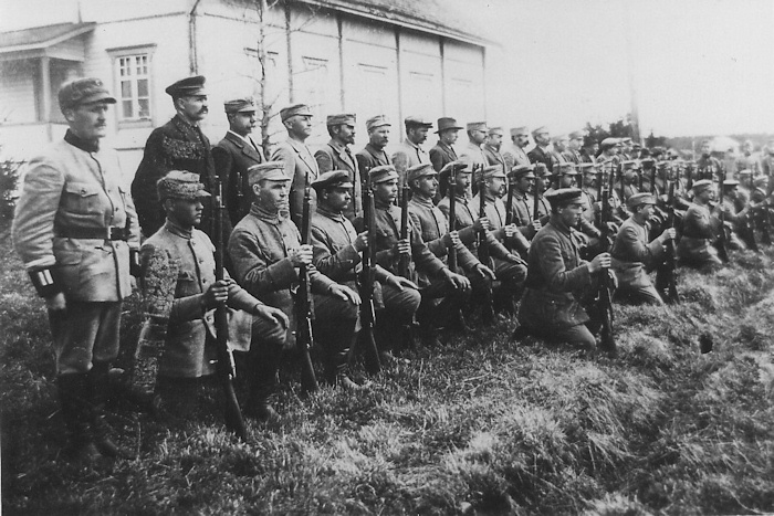 Kosken Suojeluskunta Nuortentuvan pihalla. Vas. paikallispääll. Pauli Urmas, takarivissä vas. Eeli Dikert, Aug. Alkio, Sven Luhtala, Matti Manner, Kalle Hakkinen, Frans Sipilä, Rafael Kylänpää, Maurits Mikkola, A. V. Saraja, Emil Vihanto, Albert Mikkola, Uuno Sula, Aleksi Hurra, Martti Jalli ja Jussi Savela. Eturivissä vas. Aarne Saari, Uuno Hyhkö, konst. Neuvo, Erkki Saari, Kustaa Harmaa, Emil Uotila, J. V. Teeri, Aarne Saarinen, Kalle Ali-Isotalo, Voitto Naumi. Edessä ryhmänjohtajat Einari Uotila, Akseli Mattila, Tauno Puras ja Toivo Urmas. Rivistön toisessa päässä Eero Salmi.