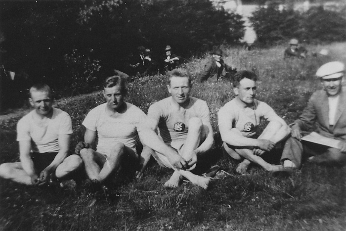 Kotiseutukokoelma0062 22.11.2015Täysi resoluutio (700 × 467) ← Edellinen Seuraava → Koskelaisia urheilijapoikia luultavasti Sorvaston urheilukentällä Kärrin talon lähellä. Vas. Erkki Tamminen, Kalle Saari, Heikki Heikkilä ja Toivo Urmas sekä huoltaja Verner Kaatiala.