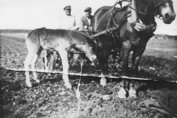 Kotiseutukokoelma0094 22.11.2015Täysi resoluutio (700 × 467) ← Edellinen Seuraava → Pieni lepotauko kylvötöiden lomassa Hongiston Naumin pellolla 1935. Koneen takana isäntä Voitto Naumi ja kylvömies Mauno Kujala. Edessä olevaa varsaa jo väsyttää.
