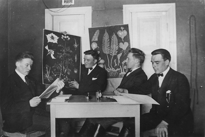 Kotiseutukokoelma0157 22.11.2015Täysi resoluutio (700 × 467) ← Edellinen Seuraava → Koskelaiset Yrjö Väinölä, Matti Laakso, Eero Virtanen ja humppilalainen Elias Syrjänen huoneessaan Jokioisten pienviljelijäkoulussa v. 1927.