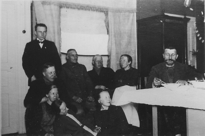 Hongiston Purhaan mamman asunnoksi rakennetussa Vanhakylä-nimisessä talossa otettu kuva. Henkilöt vas. takana virolainen emigrantti Edvard Kask, Tapalan Isokokin isäntä Kalle Isokokki, Purhaan isäntä Bruno Puras, Purhaan vanhaemäntä Aurora Puras, syömässä Tapalan Uotin isäntä Juho Uoti Edessä vas. Tauno ja Agda Puras, Impi Pinomäki ja Maire Puras.