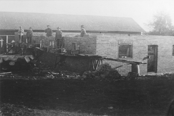 Kotiseutukokoelma0238 22.11.2015Täysi resoluutio (700 × 467) ← Edellinen Seuraava → Hongiston Mikolan sikalan muuraus käynnissä 1920-luvulla Rakennukseen tarvittavat sementtitiilet tehtiin aivan vieressä olleessa santakuopassa. Muurarien ja hantlankarien nimiä ei enää muistettu.