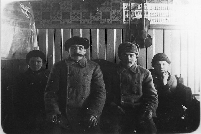 Kotiseutukokoelma0260 22.11.2015Täysi resoluutio (700 × 467) ← Edellinen Seuraava → Tyyne Saarinen, Juhani Uotila, Aarne Saarinen ja Anna Uotila (Tiensuu) kuvattuna Hongiston Uotilan tuvassa.