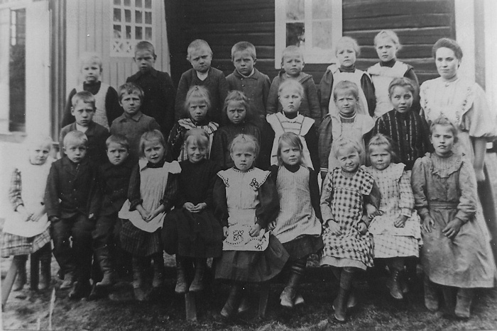 Kiertokoululaisia v. 1909 Jättälän Uudentalon pihalla. Eturivi vas. Salli Luhtala, Uuno Paavola, Jalonen, Anna Ylhäisi, Saima Simola, Siviä Uusitalo, Anna Kittilä, Elli Passi, Helmi Päivärinta ja Suoma Nummela. Toinen rivi vas. Pauli Kattelus, Arvo Päivärinta, Hilja Elo, Lahja Raitanen, Salme Saraja, Saida Ojala ja Alma Raitanen. Ylärivi vas. Katri Peltola, Johannes Jalonen, Arvo Heikkilä, Hannes Hagström, Ojala, Aili Lehtinen, ja Salli Uusitalo. Oik. opettaja Olga Kulma, myöhemmin Palmunen.