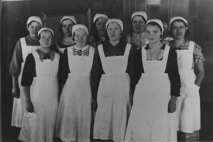 Kotiseutukokoelma0553 22.11.2015Täysi resoluutio (700 × 467) ← Edellinen Seuraava → Keittokurssilaisia Jättälän Rannikolla. Takarivi vas. Jenny Uusitalo, Meeri Manner, Elma Tiensuu, Irja Lehtinen, kurssin opettaja jonka nimi on jo unohtunut. Eturivi vas. Marjatta Vainio, Saima Koivisto, Toini Koskinen ja Esteri Tyynelä (Tausa).