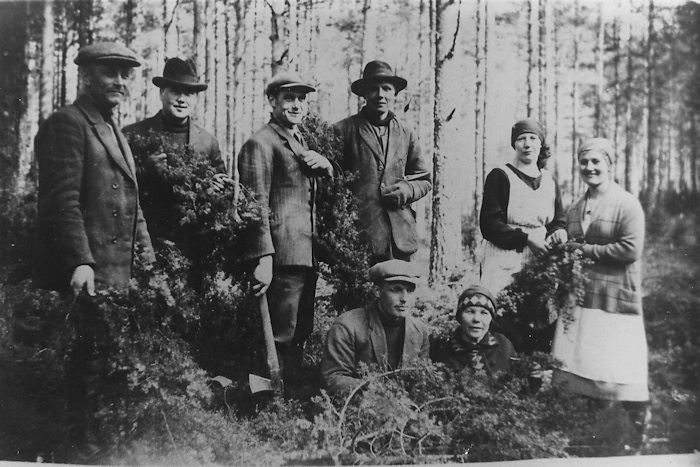 Kosken Osuuskaupan 10-vuotisjuhlan koristeeksi valmistettujen havuseppelten tekijöitä Koskenkartanon metsässä. Henkilöt vas. Sven Luhtala, Matti Alho, Eino Urmas, Erkki Tamminen, Kerttu Tamminen ja Taimi Urmas. Edessä istuvat Yrjö Virtanen ja Kerttu Rautiainen.