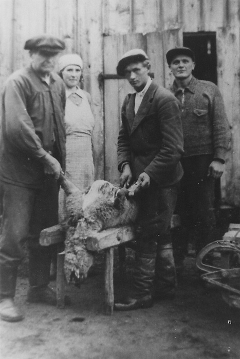 Kotiseutukokoelma0677 22.11.2015Täysi resoluutio (467 × 700) ← Edellinen Seuraava → Lammasta nyljetään Tapalan Jaakolassa. Vas. Simo Salmi, Valma Kaskinen, nyljinveistä käyttävän miehen nimi on unohtunut, oik. Armas Kaskinen.